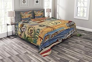 Lunarable Route 66 ベッドスプレッド オールドファッション 車 オートバイ 地図 道路 旅行 ジャーニー 米国 コンセプト 装飾キルトカバーレットセット 枕カバー付き マルチカラー クイーン bed_68978_queen