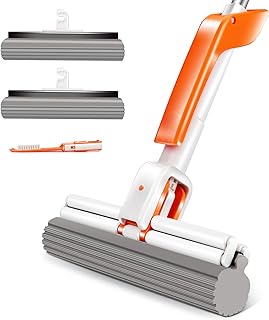 Masthome 吸水スポンジモップ フロアモップ ワイパー 水絞り器付 床掃除モップ フローリング 掃除 フラットモップ 手洗い不要 交換用スペア1枚付き