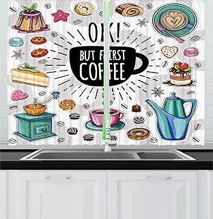 Lunarable But First Coffee キッチンカーテン コーヒーマグに散らばった食品とドリンクのグループのおいしいペーストリー ウィンドウドレープ 2パネルセット キッチン カフェ装飾 55インチ x 39インチ マルチカラー