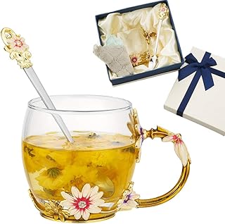 JLTPH エナメルフラワーガラス ティーカップ クリア 鉛フリー コーヒーマグ スプーンクリーニングクロス付き ティーカップ 精巧なハンドル付き レディース 誕生日 バレンタイン 結婚式 母の日ギフト